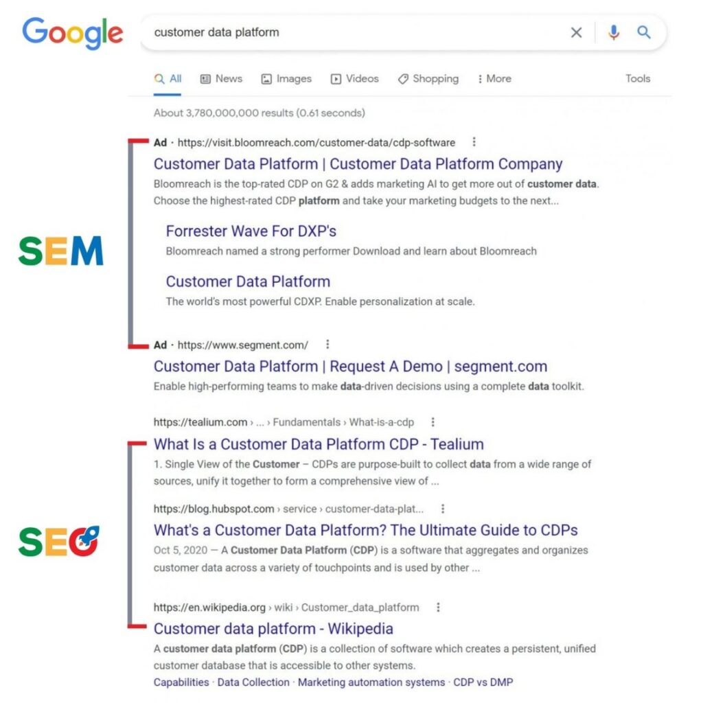 SEM adalah strategi pemasaran digital yang bertujuan untuk meningkatkan visibilitas sebuah website di halaman hasil mesin pencari melalui iklan berbayar. Salah satu platform yang paling umum digunakan adalah Google Ads. Perbedaan utama dengan SEO adalah, hasil dari SEM biasanya ditandai dengan label “Iklan” atau “Ads”. Ini adalah cara cepat untuk mendapatkan visibilitas dan traffic, namun membutuhkan biaya.